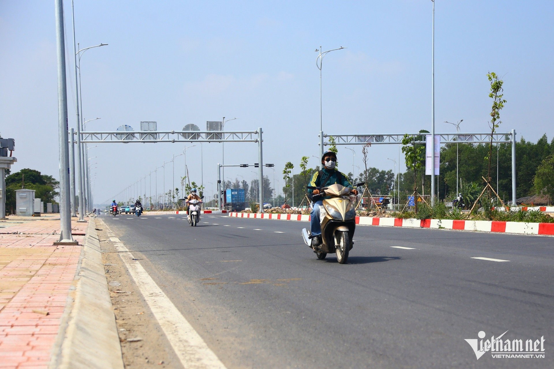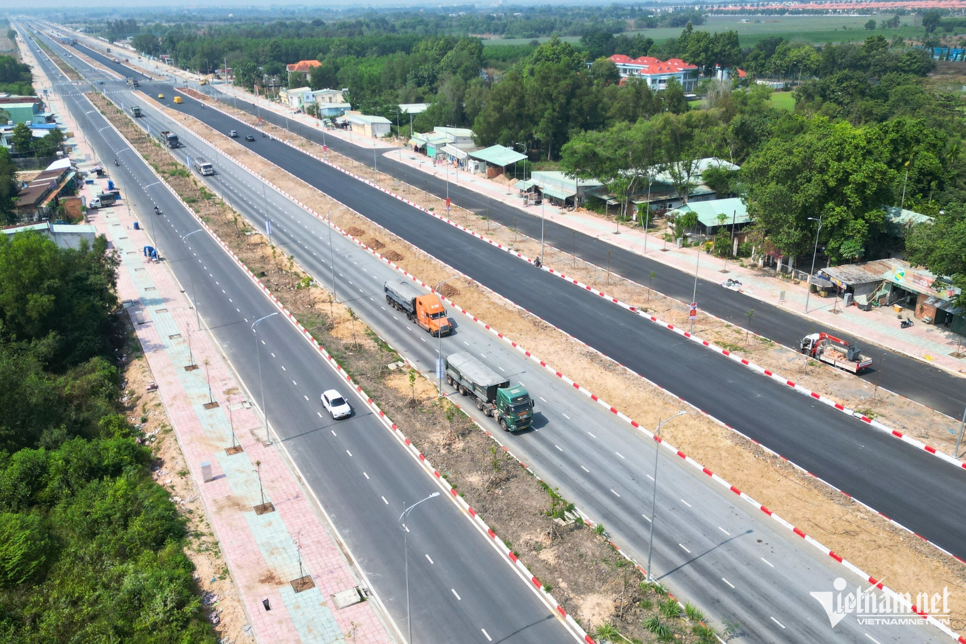 Theo ghi nhận của PV VietNamNet, đoạn từ đường Nguyễn Hữu Cảnh đến nút giao Vành đai 3 TPHCM đã cơ bản hoàn thành, với đầy đủ biển báo, vạch kẻ đường, đèn chiếu sáng và các hạng mục cây xanh.
