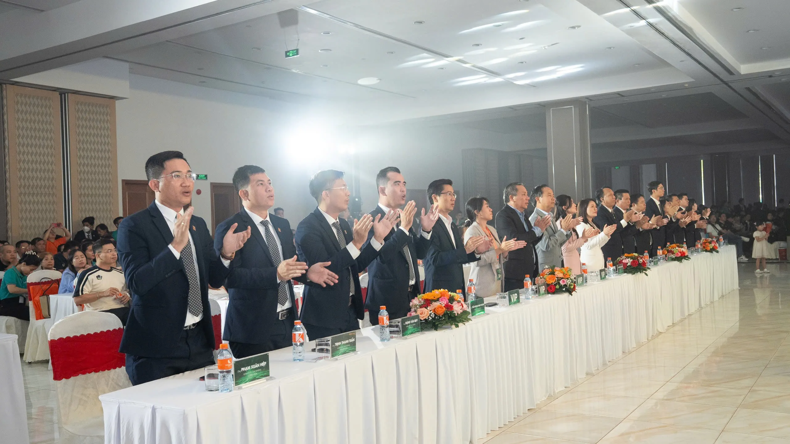 Ban lãnh đạo Kim Oanh Group và Kim Oanh Land cùng hòa mình vào không khí trang nghiêm khi tốp ca Kim Oanh Group trình diễn ca khúc truyền thống “Tự hào Địa ốc Kim Oanh”.