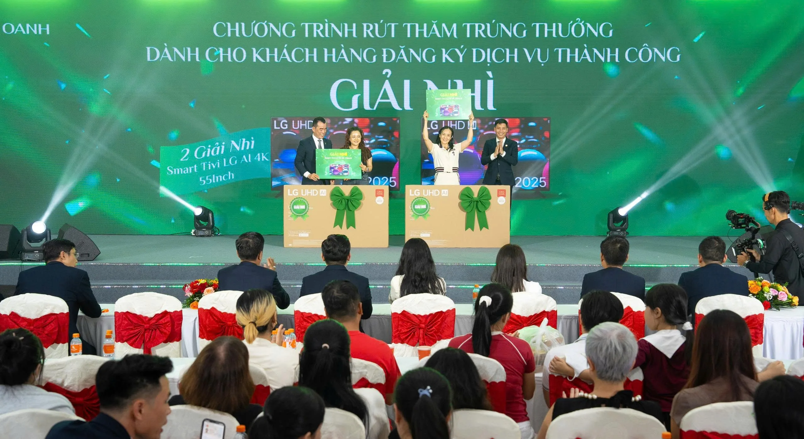 Ông Trần Trọng Minh Hoàng – Giám đốc Chi nhánh Võ Nguyên Giáp (bên trái) và ông Đặng Văn Quy – Giám đốc Chi nhánh Đồng Nai (bên phải) trao giải Nhì là 1 chiếc Smart Tivi LG AI 55inch đến 2 vị khách hàng may mắn.