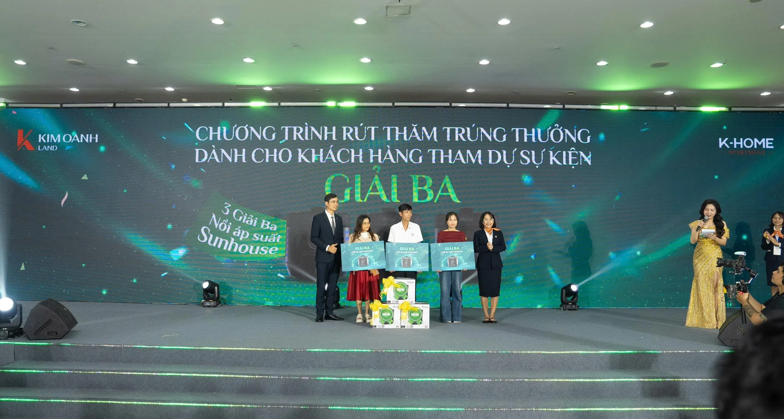 Ông Bùi Anh Đức – Phó Giám đốc Kinh doanh và Quản lý sản phẩm Kim Oanh Group và bà Phan Thị Thu Trang – Giám đốc Chi nhánh Bến Cát trao giải Ba là 1 nồi áp suất Sunhouse đến 3 vị khách hàng may mắn.