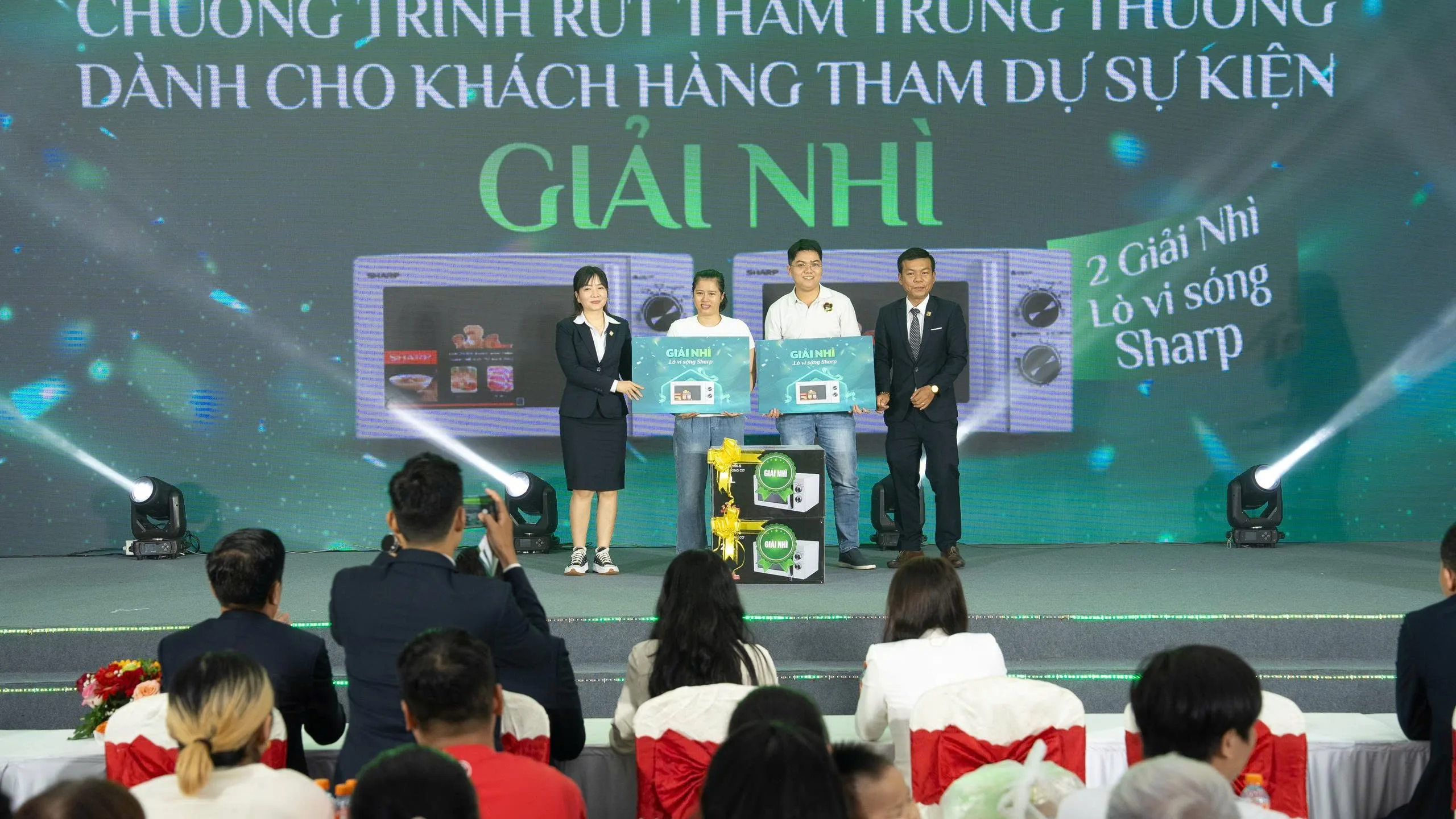 Ông Nguyễn Tấn Sự – Giám đốc Chi nhánh Phạm Văn Đồng và bà Lê Thị Hạnh – Giám đốc Chi nhánh Thành Phố Mới trao giải Nhì là 1 chiếc lò vi sóng Sharp đến 2 vị khách hàng may mắn.