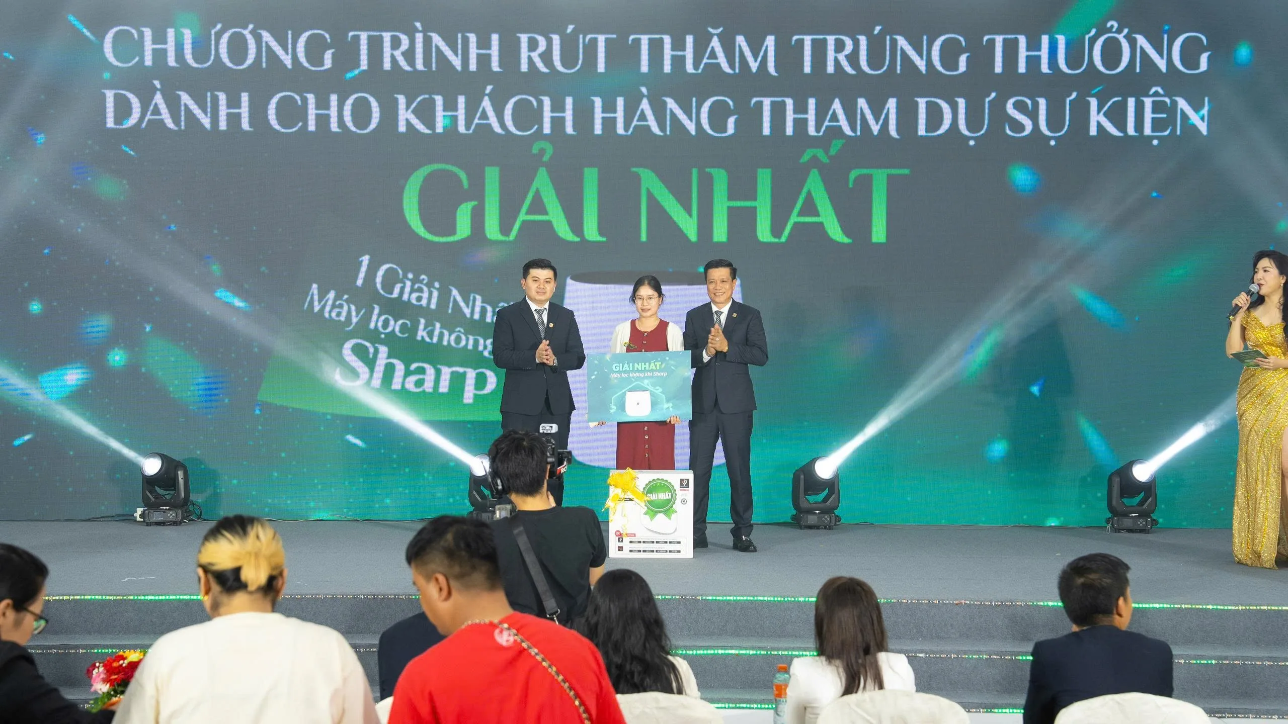 Ông Tô Duy Chinh và ông Tôn Thất Phúc – Phó Giám đốc Chiến lược kinh doanh Kim Oanh Group trao giải Nhất là 1 chiếc máy lọc không khí Sharp đến vị khách hàng may mắn trúng thưởng chương trình rút thăm dành cho khách hàng tham dự.